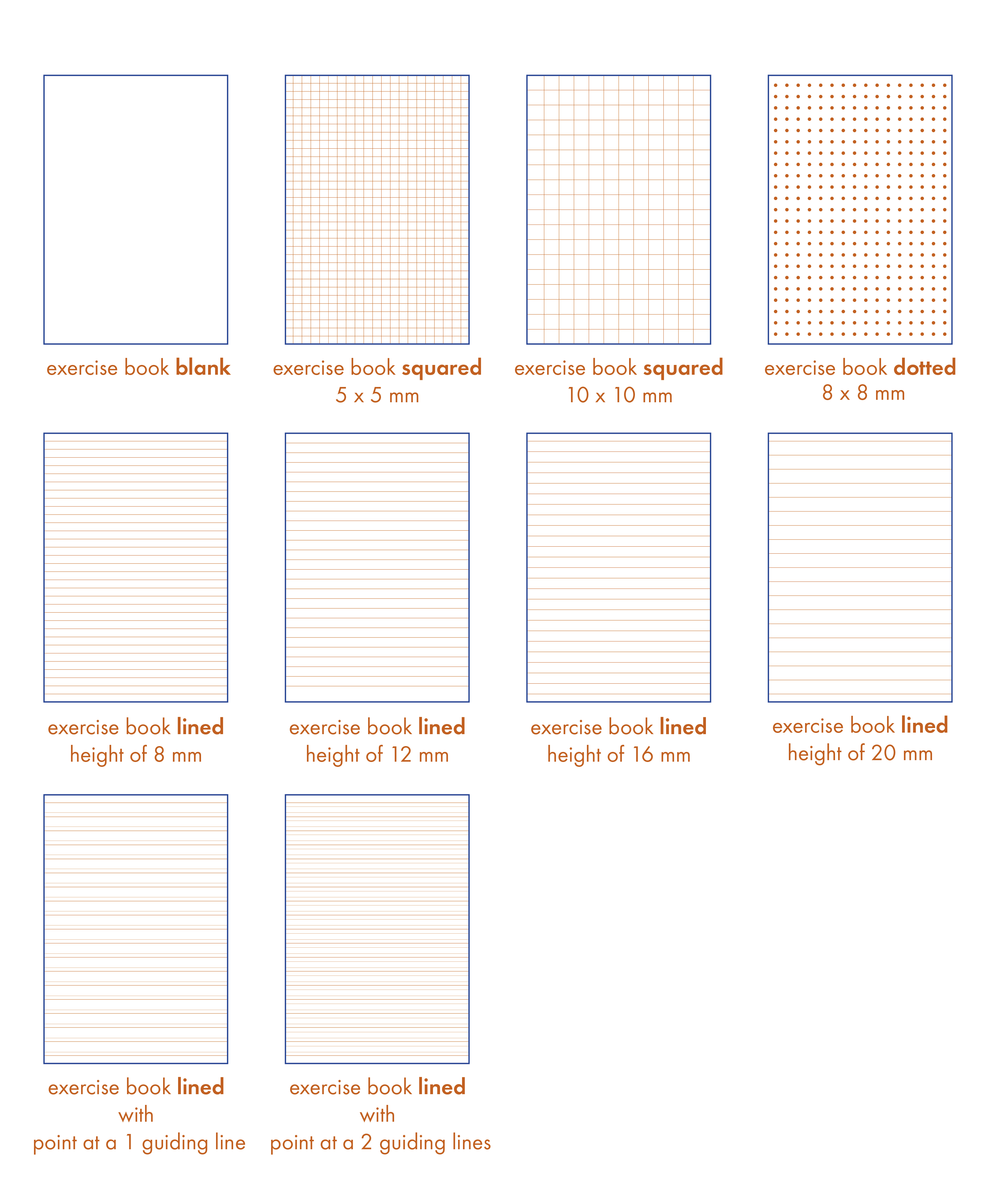 Exercise books with 10 sheets of paper are used in the first three grades where children need more space for writing letters and numbers. From the fourth grade on, teachers usually recommend using exercise books with classic 8mm lines. Children are more skilled in handwriting, and they write smaller letters so narrower lines are quite enough.